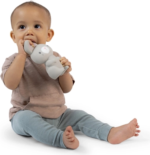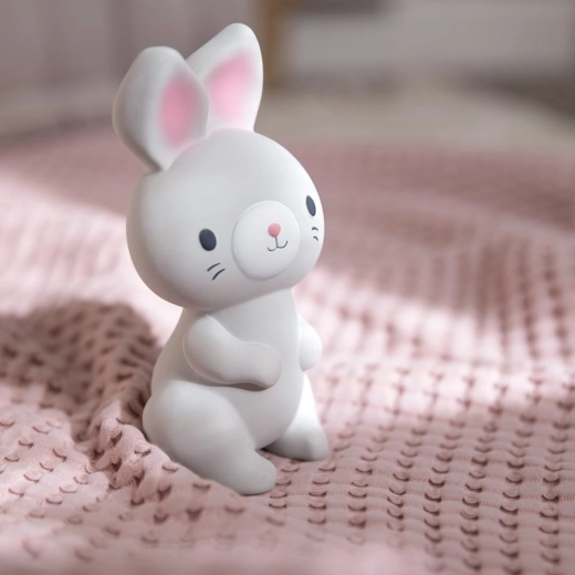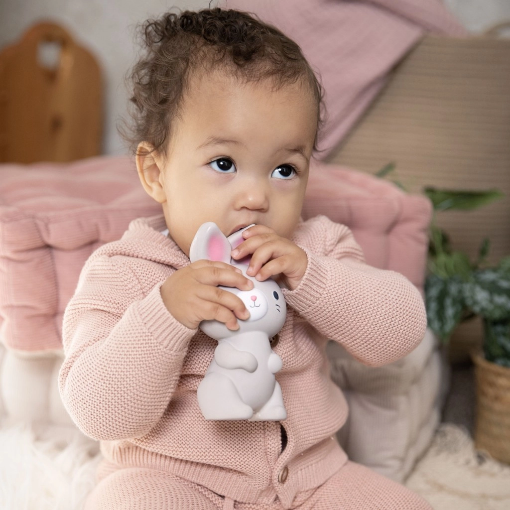Schattig bijtspeeltje in de vorm van een konijntje van natuurrubber verlicht zachtjes het doorkomen van tandjes en stimuleert de zintuigen dankzij het piepje, de texturen en de gemakkelijk vast te pakken vorm. Ergonomisch design voor de allerkleinsten vanaf 0 maanden, veilige neutrale kleuren en een zachte, soepele materiaalstructuur voor comfortabel knijpen en bijten.