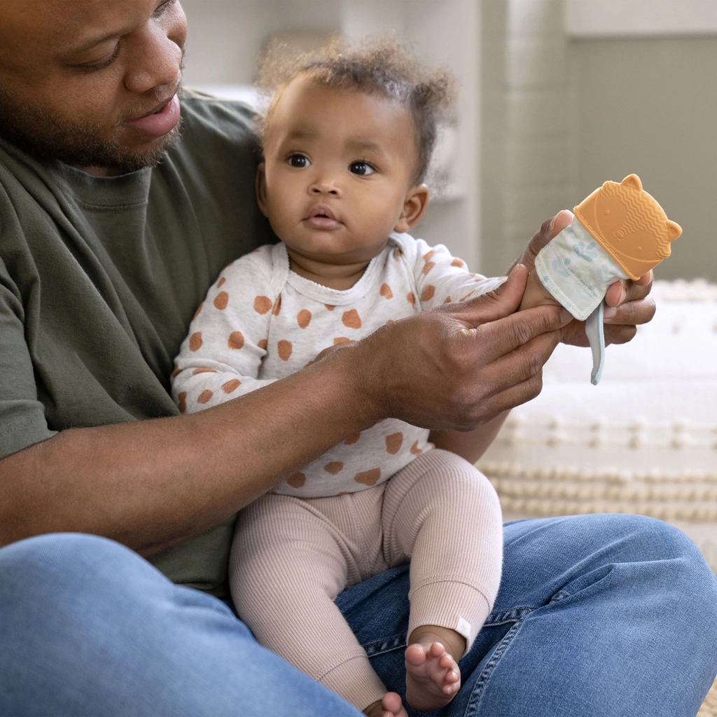 De handschoen is een uitstekende keuze voor de allerkleinsten die een klassieke bijtring nog niet kunnen vasthouden. Hij beschermt tegen krassen in het gezicht, voorkomt vallen en kwijtraken van de bijtring en de texturen nodigen uit tot tactiele ontdekking. Het compacte formaat is ideaal voor thuis en onderweg.