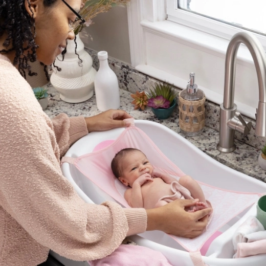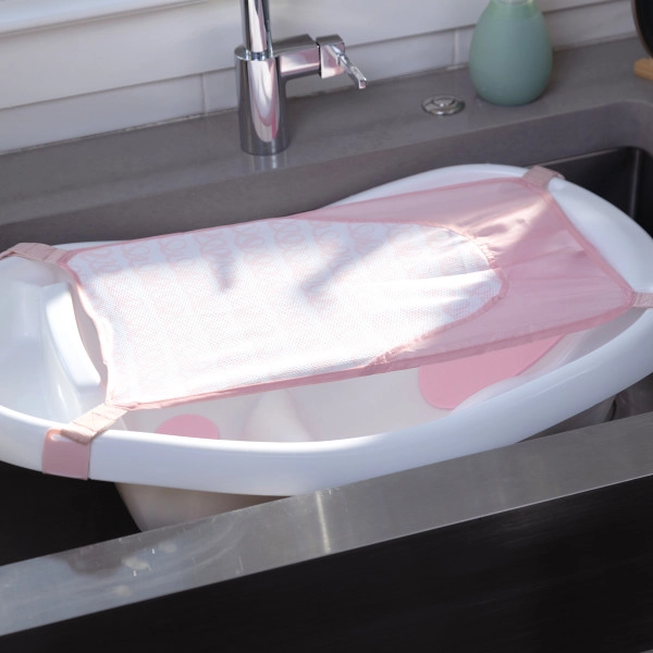 De zachte, ademende stoffen hangmat wiegt je baby voorzichtig en geeft je handen vrij voor comfortabel en veilig wassen. Ideaal voor de eerste maanden tot je kind zelfstandig kan zitten.