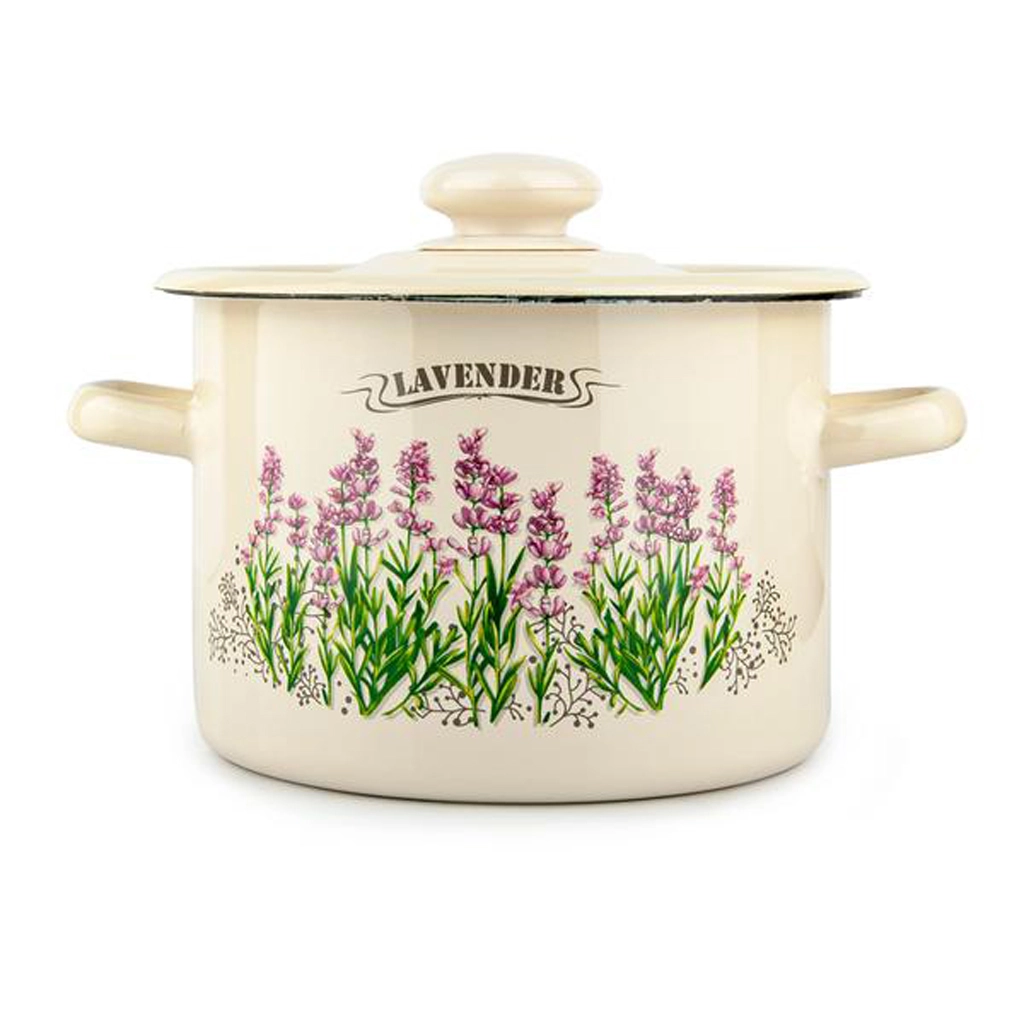 Elegante geëmailleerde pan met deksel en lavendeldecor, ideaal voor dagelijks koken. Geschikt voor alle soorten kookplaten inclusief inductie, heeft een inhoud van 4,5 l en praktische handgrepen voor veilige hantering. Perfect voor het bereiden van soepen, sauzen en stoofgerechten en verfraait tegelijk uw keuken als een stijlvol accessoire.