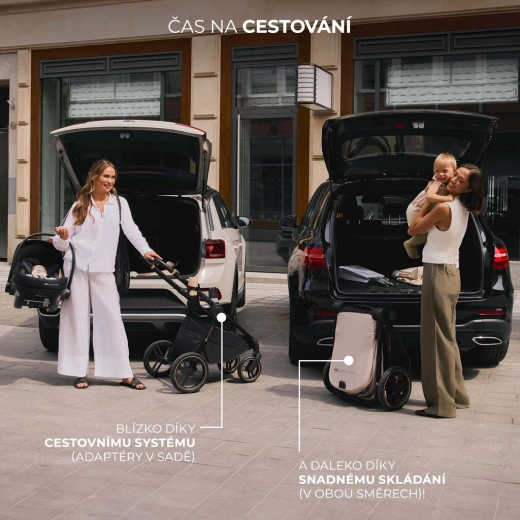 De systemen SELF STANDING en AUTO LOCK maken de bediening eenvoudig. In de set vind je adapters voor het autostoeltje, een regenhoes, een muskietennet, beenkappen, een bekerhouder en een luiertas.