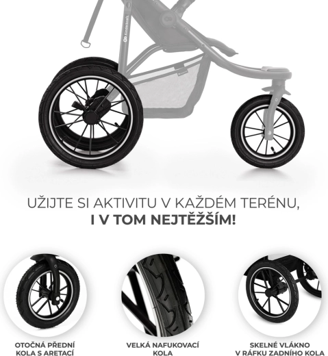De met glasvezel verstevigde achterwielen zijn licht, sterk en slijtvast. Ze ondersteunen de vering en verlengen de levensduur van de kinderwagen, zelfs bij frequent gebruik.
