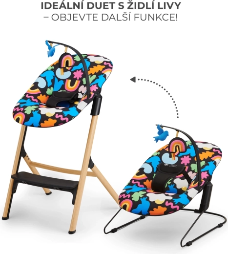 Doordacht comfort voor ouder en kind. De lichte constructie is gemakkelijk door het huis te verplaatsen, de hoes haal je er eenvoudig af en was je met de hand. De speelboog met speeltjes motiveert tot het optillen van de armpjes en traint de greep, wat de motorische ontwikkeling ondersteunt. In een handomdraai koppel je het wipstoeltje aan de stoelen LIVY of IGEE en krijg je een hoog wipstoeltje – zo heb je je kind altijd in het zicht.
