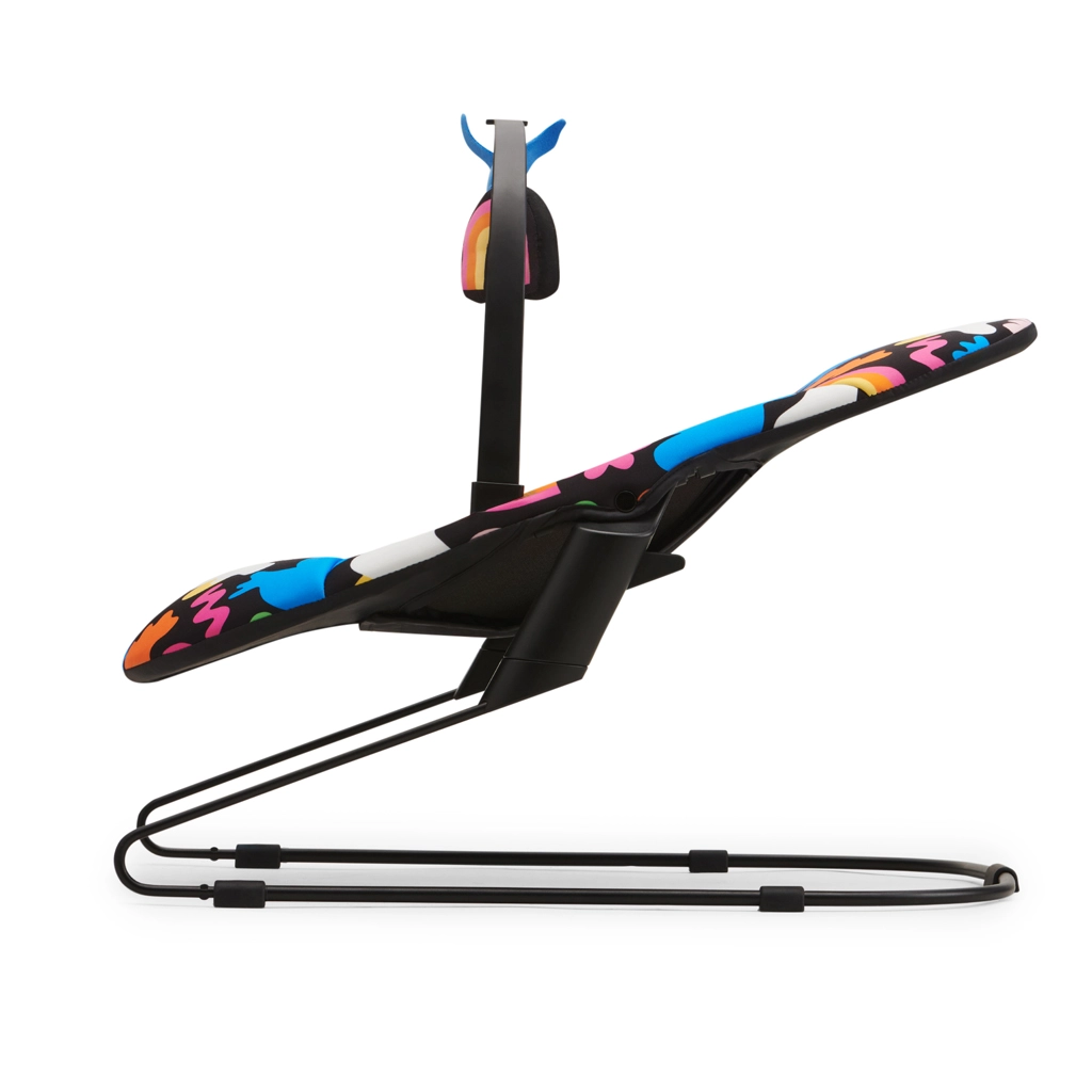 Een brede basis met antislip-elementen en driepuntsriemen zorgen voor veiligheid. De speelboog met speeltjes stimuleert grijpen en coördinatie.