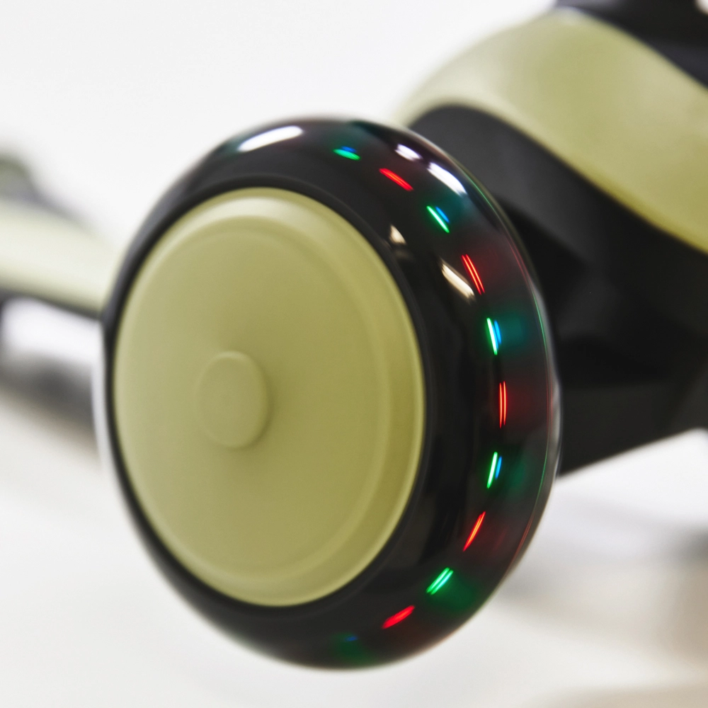 Grote voorste PU wielen met LED lichten op tijdens het rijden. Ze verhogen de zichtbaarheid in schemerlicht en geven de rit een opvallende look zonder batterijen.