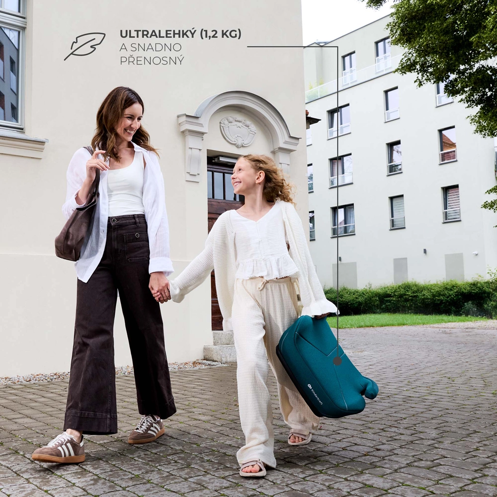 De zitting is ultralicht (1,2 kg), waardoor je hem eenvoudig tussen auto’s kunt verplaatsen. De installatie is intuïtief met de 3-punts autogordel, terwijl de brede en zachte zitting van kwaliteitschuin comfort biedt, ook tijdens langere ritten. Ergonomische handgrepen helpen de gordel op de juiste hoogte te geleiden en de afneembare hoes kan in de wasmachine worden gewassen.