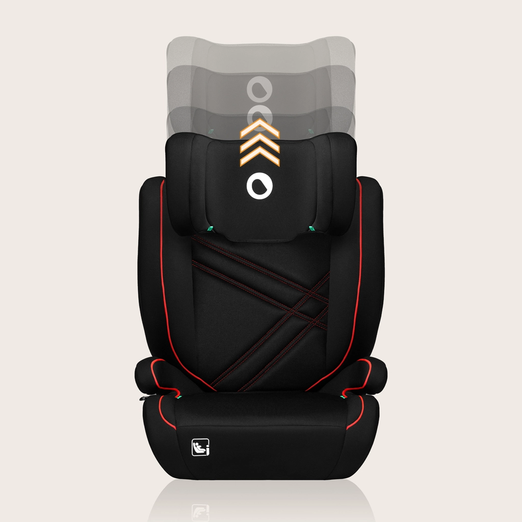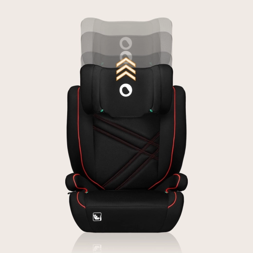 Voor lange ritten is er zachte vulling met EPE-schuim in zitting, hoofdsteun en zijkanten en ademend mesh in het zitgedeelte voor betere luchtcirculatie. De brede ergonomische zitting biedt comfort ook voor oudere kinderen en de armleuningen helpen bij de juiste geleiding van de gordel. De 8-voudige versteling van de hoofdsteun pas je snel met één hand aan de actuele lengte van het kind aan.