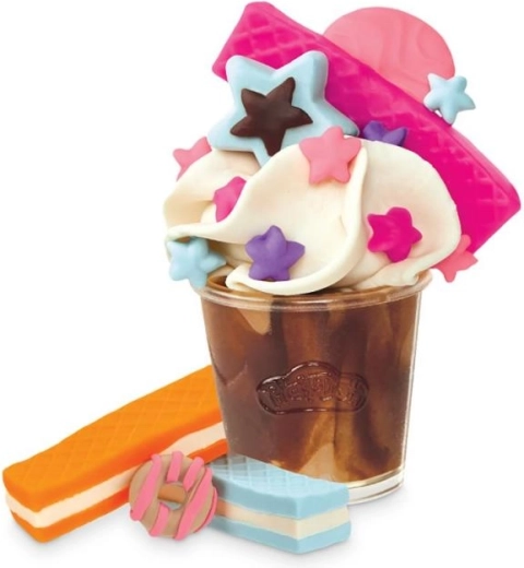 - Drankjesmachine met hendel, “slagroom”-station, vormpjes voor koekjes/cupcakes/donuts, bekertjes en gereedschap, transparante vitrine, 8 potjes Play-Doh-klei, in totaal 20 accessoires