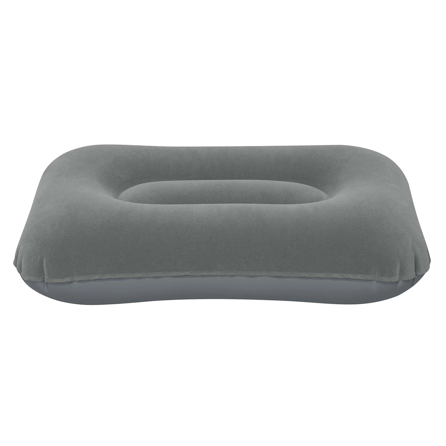 Licht en compact opblaasbaar kussen van BESTWAY met afmetingen 42 × 26 × 10 cm, ideaal voor reizen, kamperen en thuis. Het heeft een zachte fluwelen (geflockte) toplaag, een ergonomische coil-beam constructie voor betere ondersteuning van hoofd en nek, en snel opblazen en leeglaten. Opgevouwen neemt het minimaal ruimte in en past het gemakkelijk in een zak of rugzak.