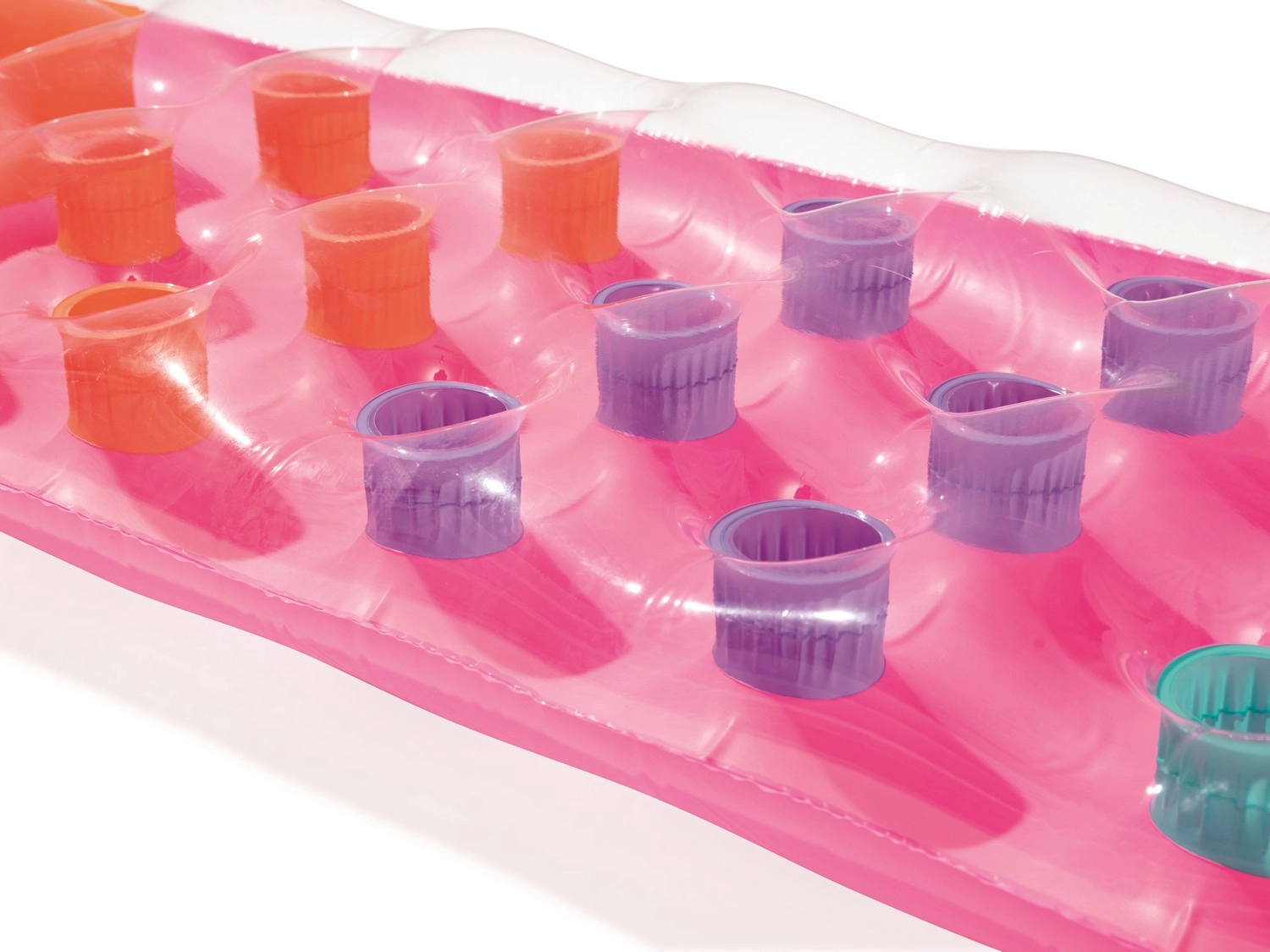 Gekleurde luchtzakken en de I‑beam‑constructie verdelen het gewicht, verhogen het drijfvermogen en zorgen voor stabiel liggen op het water.