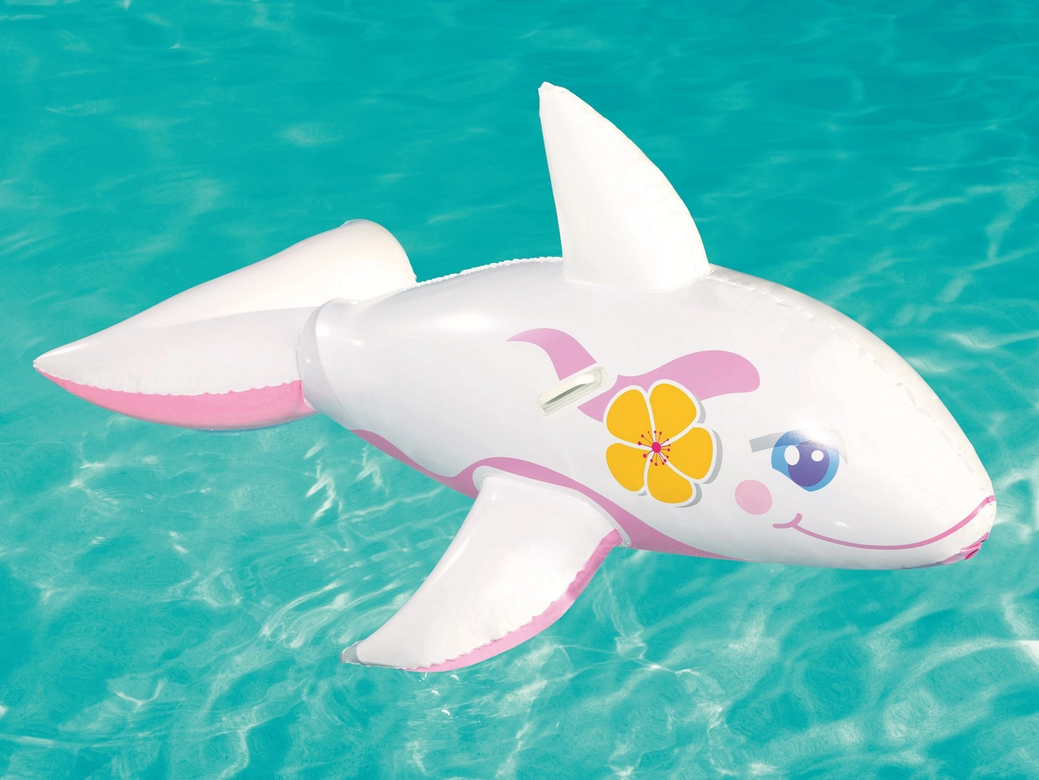 De walvisvorm met vinnen en staart zorgt voor een betere balans op het wateroppervlak en trekt de aandacht met een vrolijke print.