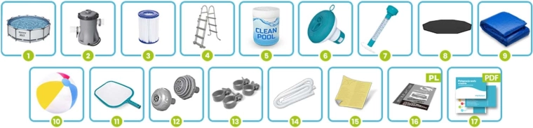 Het BESTWAY framezwembad 366 × 100 cm biedt de ideale combinatie van sterkte, veiligheid en eenvoudige montage. Het roestbestendige stalen frame en 3-laags PVC met nylonversterking weerstaan dagelijks gebruik, terwijl de mozaïekprint aan de binnenzijde het water een frisse uitstraling geeft. Dankzij de royale 17-in-1 set heb je alles bij de hand – van filtratiesysteem en chemicaliën tot afdekzeil en ondervloer.