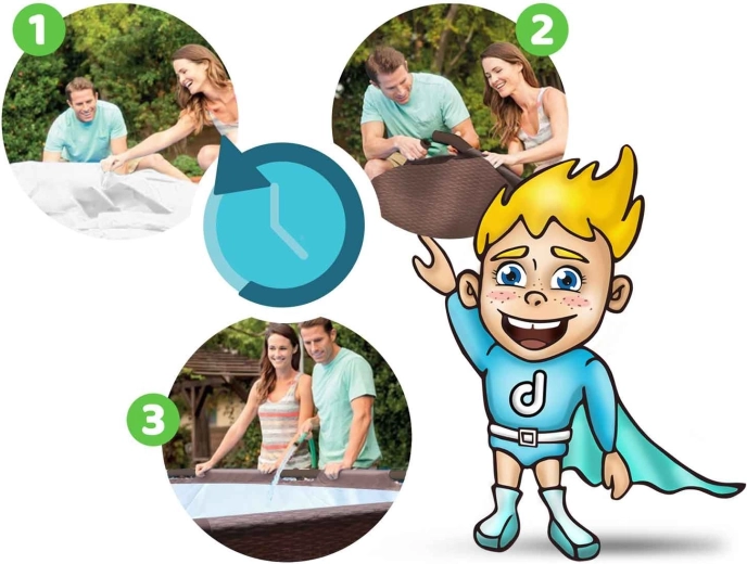 De installatie verloopt in drie stappen: ondervloer uitrollen, het frame zonder gereedschap monteren, water laten inlopen. Voor nog meer zwemplezier zijn ook zwembril en een gekleurde strandbal inbegrepen.
