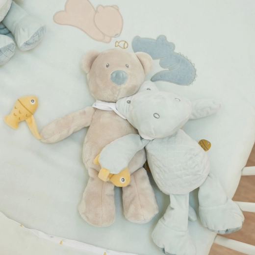 - Stimuleert zintuigen en motoriek – oren, staart, sjaaltje en visje nodigen uit tot grijpen en ontdekken.