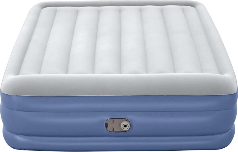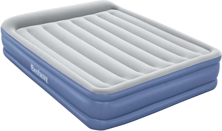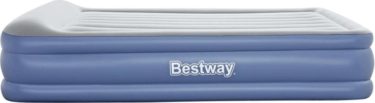 Tweedelige opblaasbare BESTWAY-luchtmatras met afmetingen 203 × 152 × 46 cm biedt comfortabele slaap voor 2 personen, snel opblazen met de ingebouwde elektrische pomp in ca. 4 minuten en een stabiele I‑beam-constructie van duurzaam Tritech-materiaal. Voorzien van een suède-achtig (flock) oppervlak voor extra comfort, een geïntegreerde kussenrand en in de verpakking ontbreken draagtas en reparatiepatch niet.