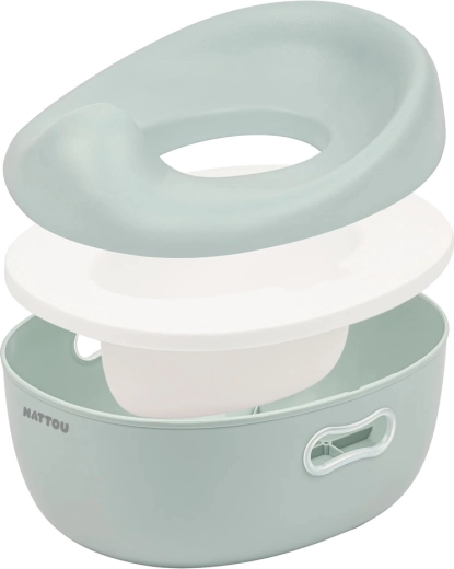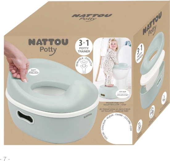 Universeel 3-in-1 potje van het merk NATTOU dat meegroeit met je kind: van los potje, via een toiletverkleiner tot een praktisch opstapje. Biedt een zachte en comfortabele zitting, eenvoudige reiniging en een stabiele constructie voor veilig zindelijkheidstraining.