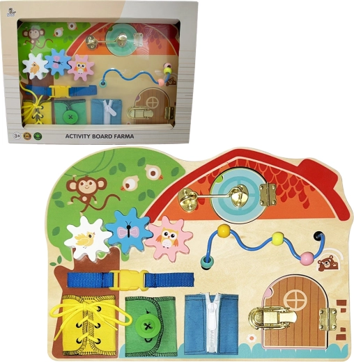 De actieve speelplaat met vrolijke boerderijomgeving biedt kinderen natuurlijk leren door te spelen. Dieren, boerderijtjes en diverse interactieve elementen nodigen uit om te ontdekken, trainen de vingertjes en ondersteunen de concentratie. De robuuste houten afwerking voelt prettig aan en is bestand tegen dagelijks gebruik.