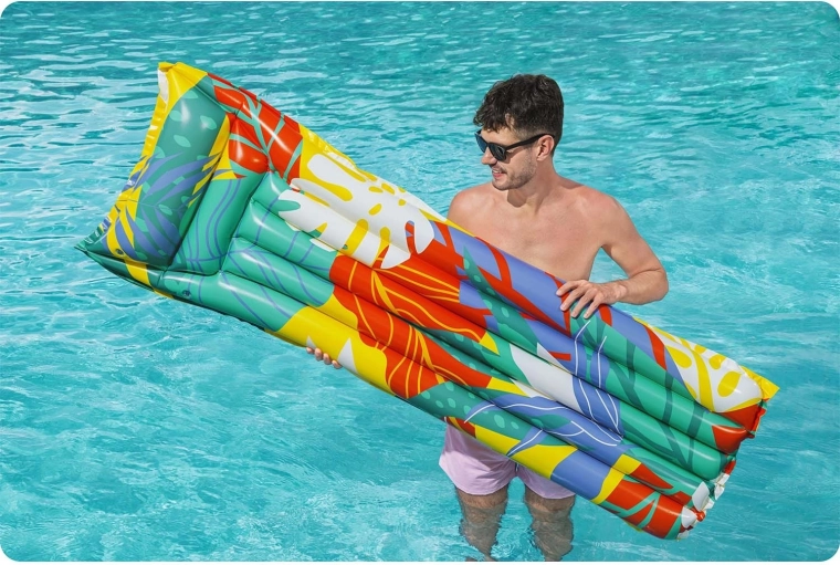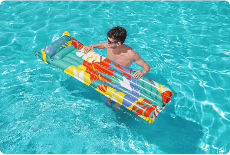 Het BESTWAY opblaasluchtbed is perfect voor zomerse ontspanning en plezier. Dankzij de lichte en duurzame PVC-constructie is het makkelijk te dragen, snel op te blazen en biedt het comfortabel liggen met hoofdonsteuning. Het opvallende tropische design springt direct in het oog en geeft je waterrelax een stijlvolle touch.