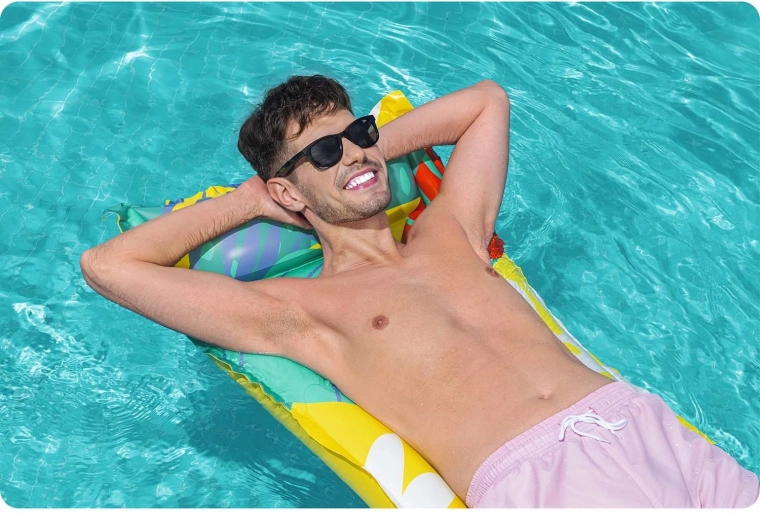 De kleurrijke print met tropische motieven geeft je waterplezier stijl en maakt het luchtbed makkelijk terug te vinden.