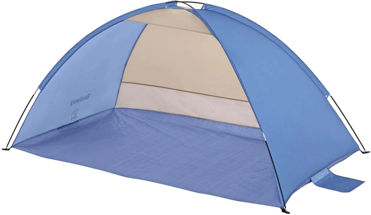 Praktische zandzakken worden aangevuld met de meegeleverde vier haringen voor een betrouwbare verankering. Inclusief draagtas met handvat, zodat je de tent gemakkelijk overal mee naartoe neemt. De afmetingen 200 × 120 × 95 cm bieden comfortabele ruimte voor twee personen en de bodem beschermt tegen vocht en zand.