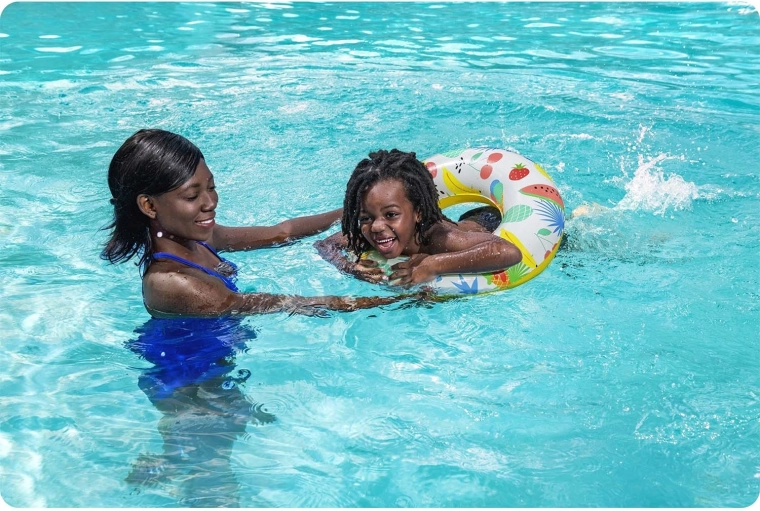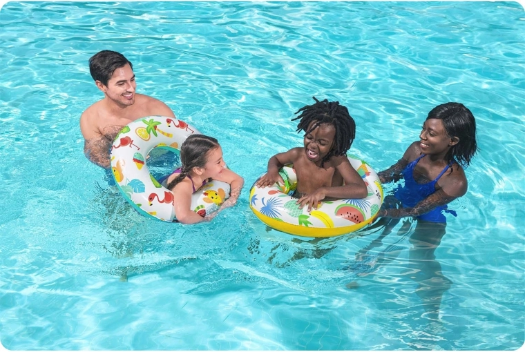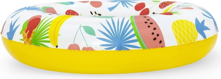 Het vrolijke design met watermeloenen, bananen en andere vruchten spreekt kinderen meteen aan en vergroot tegelijkertijd de zichtbaarheid op het wateroppervlak. De ronde “donut”-vorm zorgt voor stabiliteit en een comfortabele grip tijdens spelen en ontspannen.