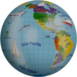 Een lichte en speelse sportbal voor kinderen met wereldbolmotief biedt een waterbestendig materiaal, een diameter van 23 cm en universeel gebruik in de tuin, op het speelveld en in het zwembad. Dankzij de mogelijkheid om bij te pompen blijft hij langdurig in perfecte conditie.
