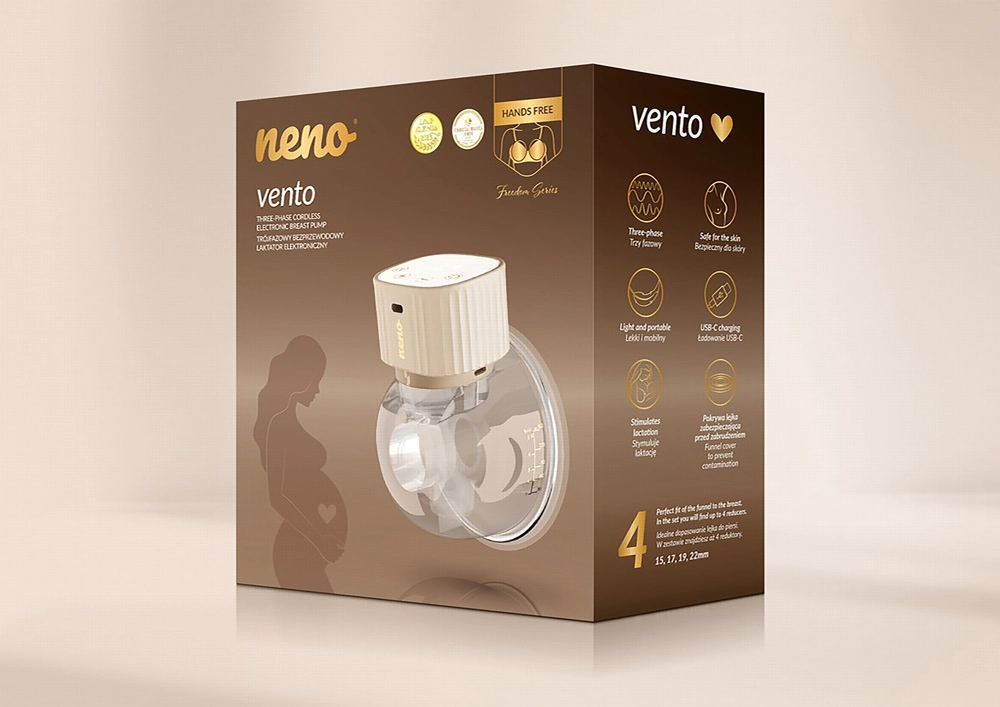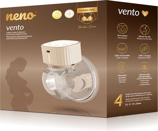 Neno Vento is een moderne, elektrische, draagbare borstkolf ontworpen voor bewegingsvrijheid en comfort. Hij past rechtstreeks in de beha, werkt volledig zonder kabels en maakt dankzij de stille werking discreet kolven mogelijk, op elk moment van de dag en nacht. De driefasen-zuigtechnologie – stimulatie, diepe afkolfmodus en gecombineerde modus – bootst natuurlijk voeden na en helpt de lactatie effectief op gang te brengen en te onderhouden.