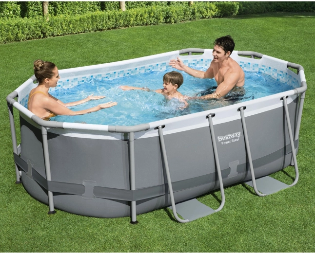 De complete BESTWAY Power Steel set biedt comfort en zekerheid. Snelle montage zonder gereedschap kost slechts een paar stappen: het zeil uitrollen, de wanden in het frame klikken en vullen met water. Verstevigde wanden van drielaags PVC met nylonversterking en een stevig stalen frame garanderen een lange levensduur en stabiliteit. Het mozaïekpatroon aan de binnenzijde geeft het zwembad een premium uitstraling.