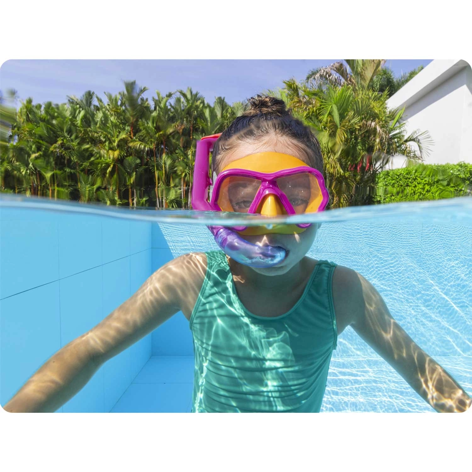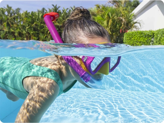 De set bevat ook een snorkel met een comfortabel siliconen mondstuk dat zich natuurlijk aan de mond aanpast, en een bovenkap die voorkomt dat opspattend water van het oppervlak naar binnen komt. De set is latexvrij, huidvriendelijk en geschikt voor regelmatig waterplezier in het zwembad en aan zee.
