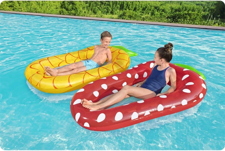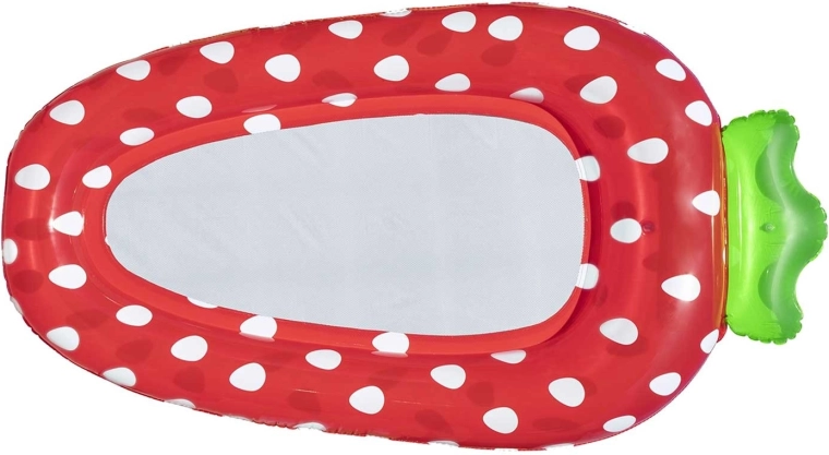 Het opblaasbare luchtbed in aardbeivorm brengt een speels zomers design en comfort voor ontspanning op het water. Het is licht, duurzaam en door de felle kleuren valt het overal op – bij het zwembad, op het strand en op het meer.