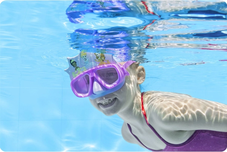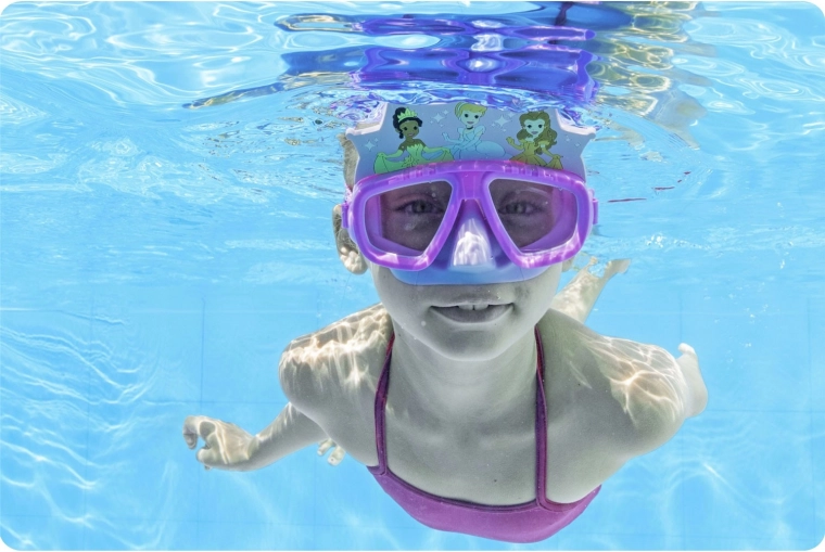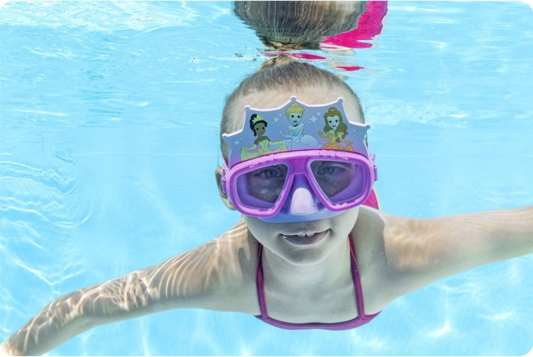 Het Bestway duikmasker voor kinderen met PRINCESS-motief biedt een breed gezichtsveld, comfortabele, lekvrije pasvorm en een verstelbare siliconenband voor zekere bevestiging. Polycarbonaat lenzen met UV-bescherming zorgen voor helder zicht onder water en veiligheid voor de ogen. Ideaal voor kinderen vanaf 3 jaar, voor spel in het zwembad en de eerste snorkelervaringen.