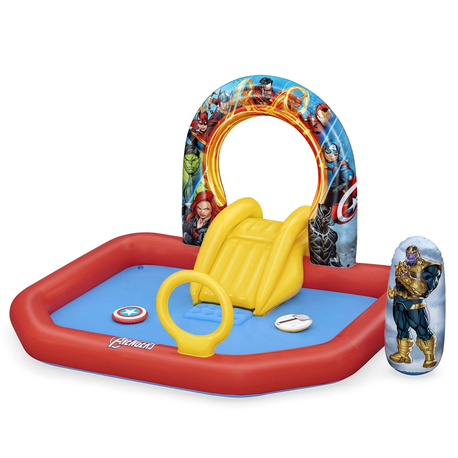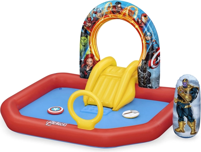 Maak de zomer van kinderen nog leuker met het opblaasbare water speelcentrum MARVEL Avengers. Het biedt een leuke glijbaan, een zachte landingsbodem, ringwerpen en een zelfoprichtende boksfiguur van Thanos. Duurzaam PVC‑materiaal, veilige zachte wanden en eenvoudige aansluiting op de tuinslang voor verfrissend waterplezier.