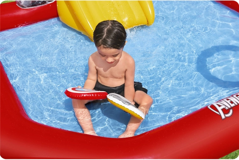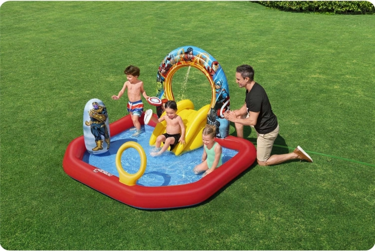 Het opblaasbare speelbad met MARVEL Avengers-thema verandert de tuin in een actiezon e. Dankzij de zachte opblaasbare bodem en randen is spelen comfortabel en veilig, terwijl het stevige PVC‑materiaal voor een lange levensduur over vele seizoenen zorgt.