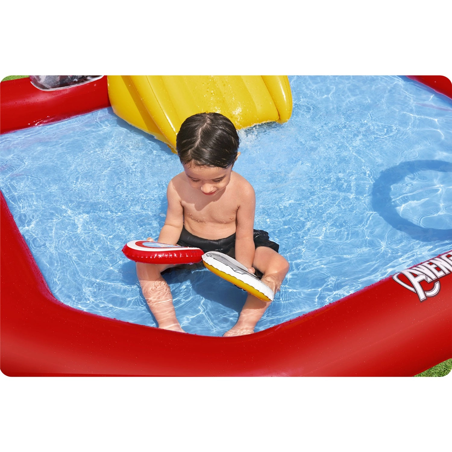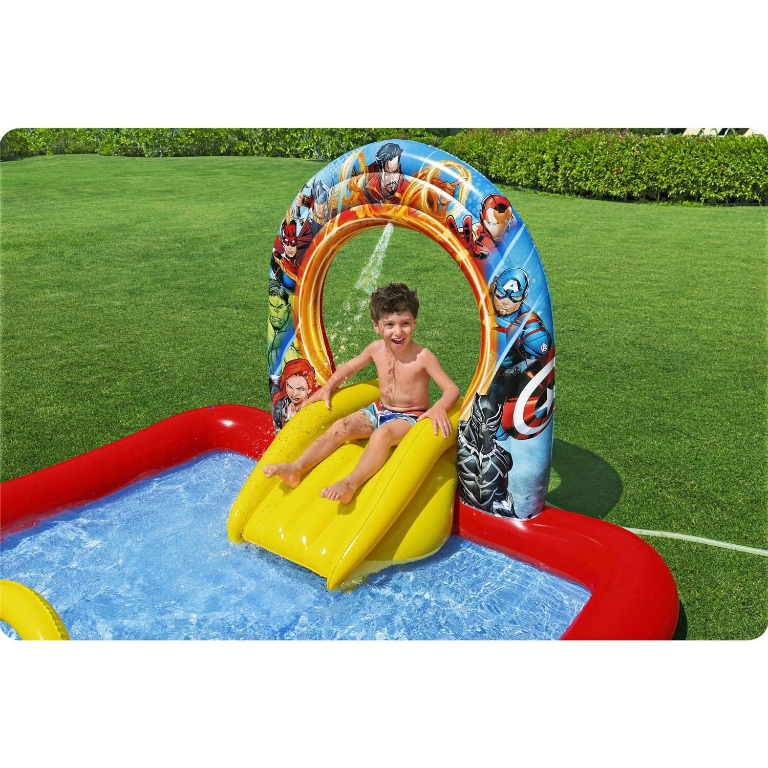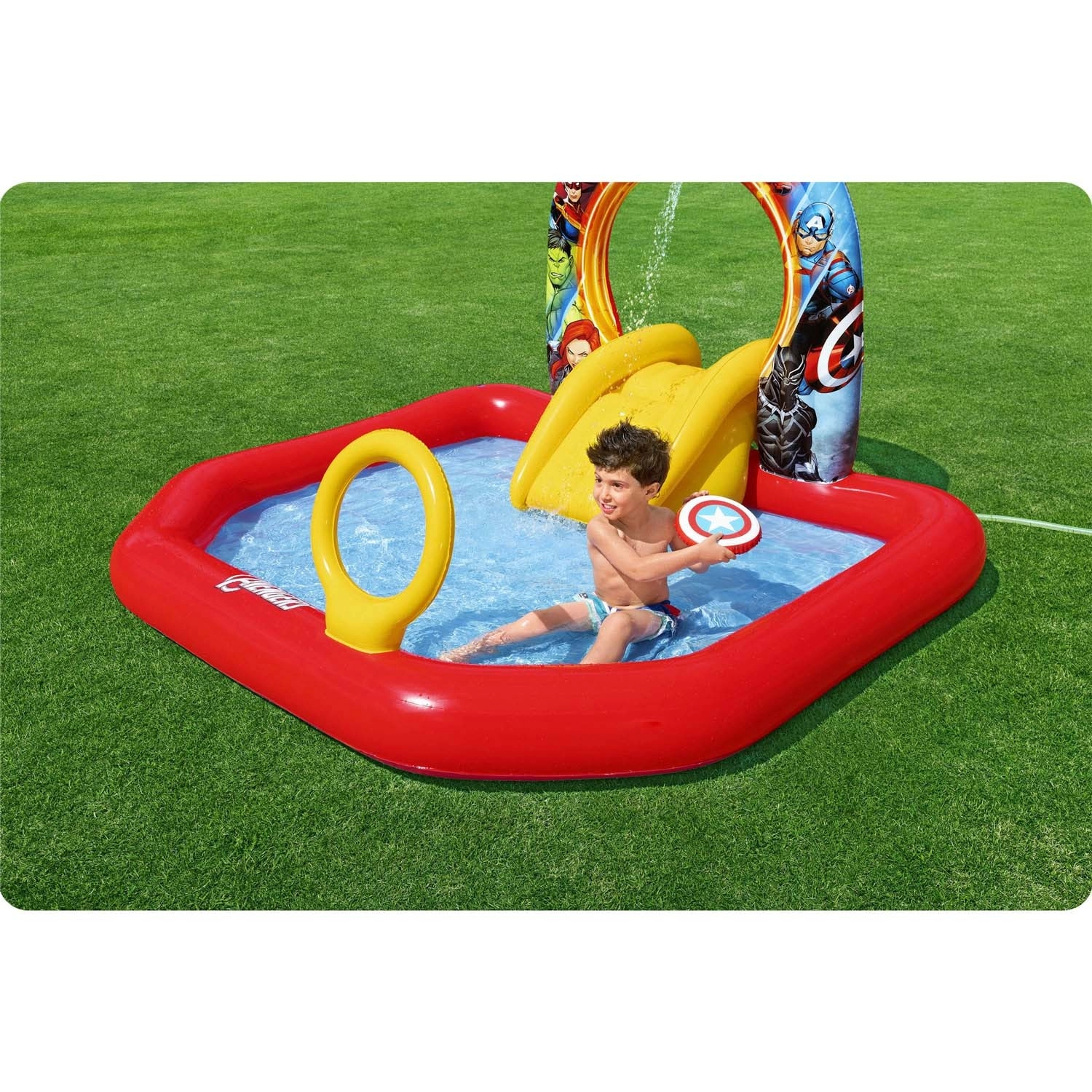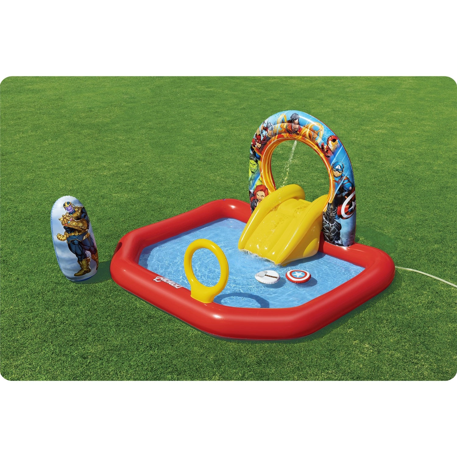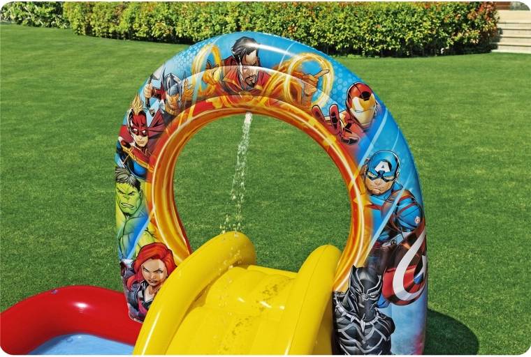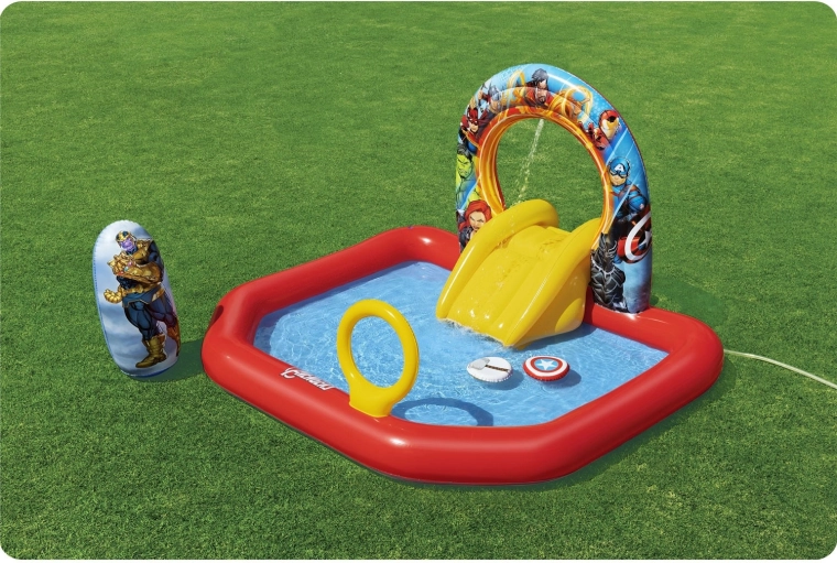 Kinderen wachten tal van activiteiten: een gele glijbaan naar ondiep water, ringwerpen op doelen en een zelfoprichtende Thanos om reactievermogen en coördinatie te trainen. Kleurrijke heldengrafics stimuleren beweging en interactief buitenspelen.
