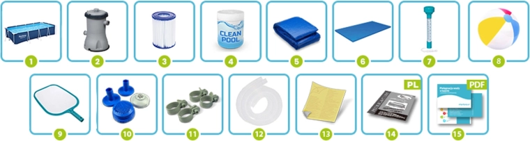 Filterpomp met cartridge type II, afdekzeil, ondervloer, chemicaliën, chloordrijver, thermometer en schepnet – alles voor eenvoudig onderhoud en comfort.