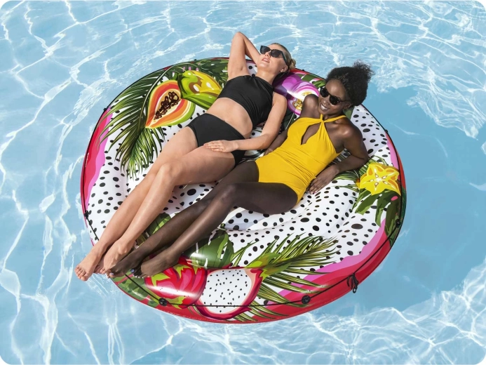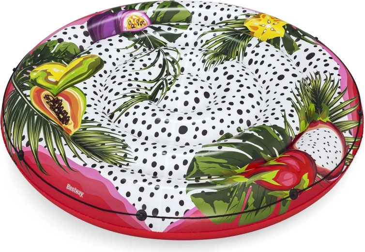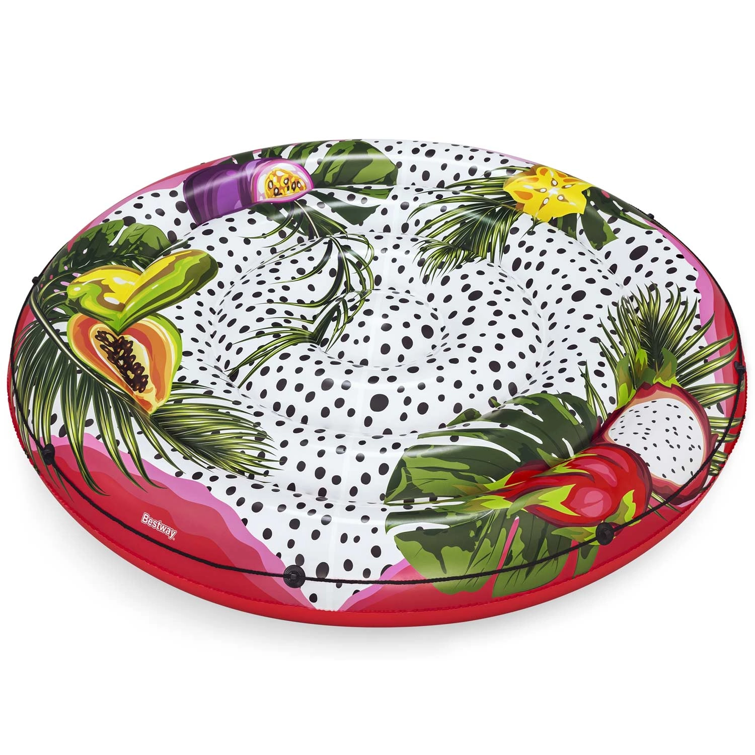 Ontdek comfort en plezier op het water met het BESTWAY drijvende eilandleesbed in XXL-formaat. Dankzij het ruime, ronde oppervlak geniet je van relaxen met z’n tweeën, of het nu in het zwembad, op het meer of aan zee is. De tropische print met fruit en bladeren geeft je zomeroutfit extra flair en trekt overal de aandacht.