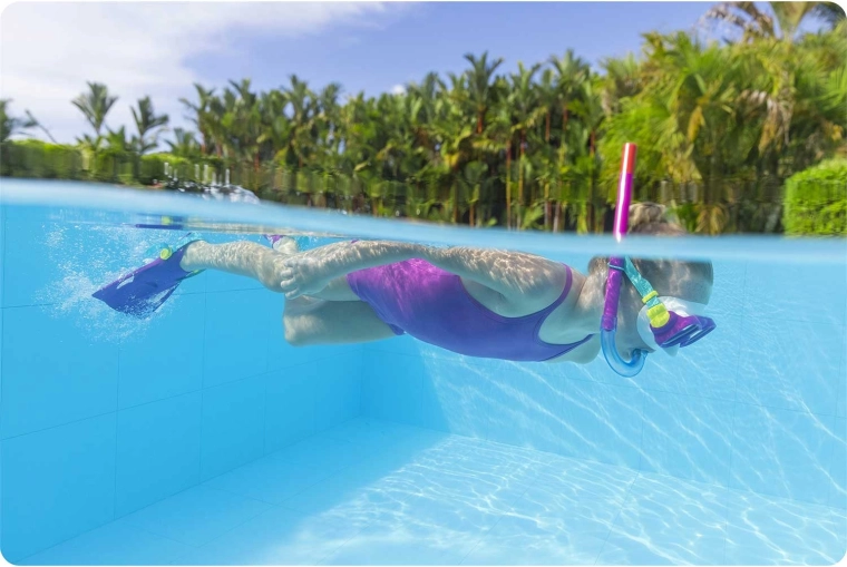 De snorkel is voorzien van een terugslagventiel dat het uitblazen van water uit de buis vergemakkelijkt, en een ergonomisch gevormd mondstuk voor aangenaam ademen. Vinnen met open hiel en een verstelbare band in maat 37–41 zorgen voor een efficiënte slag en soepele beweging in het water.