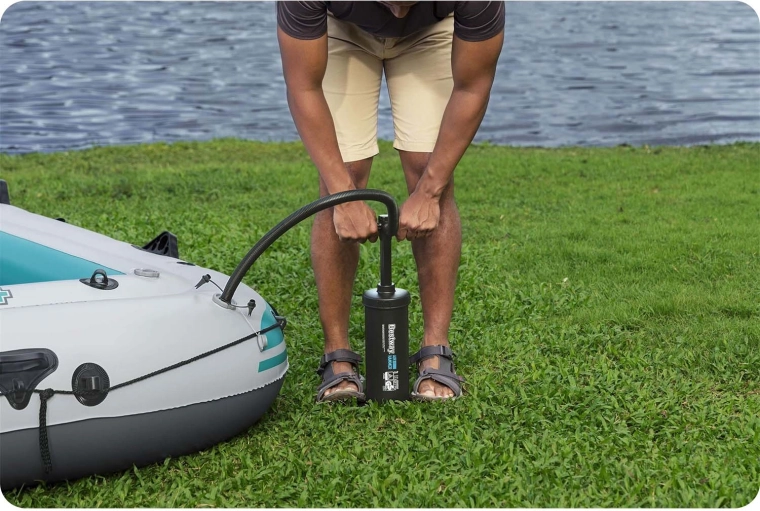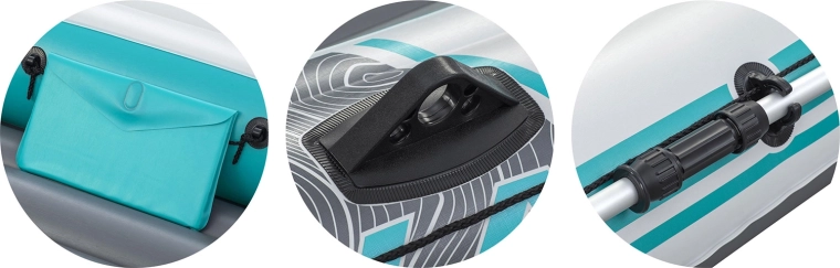 De praktische uitrusting omvat 2 opblaasbare zitjes en 1 opblaasbaar kussen, houders en vergrendelingen voor peddels, D-ringen en een opbergvak voor kleinigheden. De set bevat ook 2 peddels, een handpomp met zuiger, een reparatiepatch en een draagtas voor eenvoudig inpakken en transport.