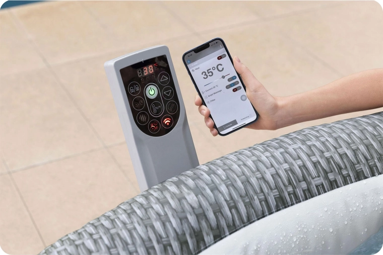 Stel temperatuur, bubbels en pomp in via het overzichtelijke touchpanel of de mobiele app. Geniet op elk moment van een warm bad, met verwarming ca. 1,8–2,4 °C/uur.