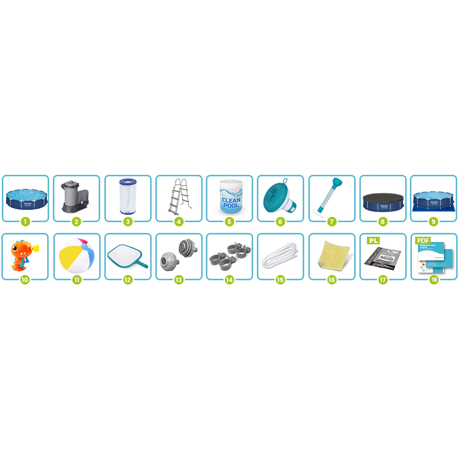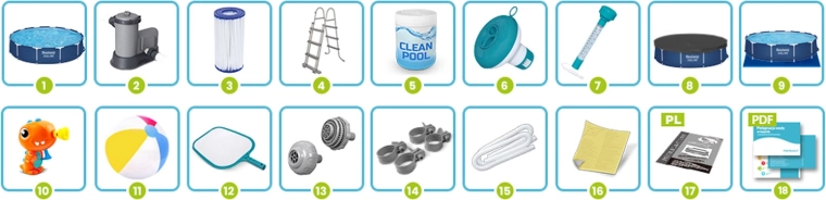 De verpakking bevat een complete set voor comfortabel gebruik: een filterpomp met patroonfilter, multitabletten voor desinfectie, een chemiedispenser met thermometer, beschermend afdekzeil en ondertapijt, een schepnet voor vuil en installatietoebehoren. Alles voor kristalhelder water en eenvoudig onderhoud de hele zomer lang.
