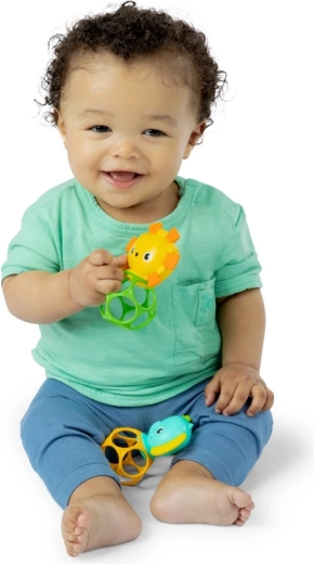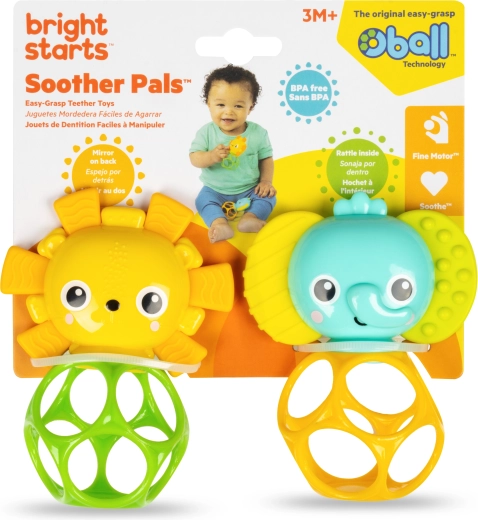 Ontdek rustgevend speelplezier met de OBALL Soother Pals-bijtspeeltjes. Twee schattige figuurtjes – een leeuw en een olifant – combineren meerdere texturen om te bijten, rammelen en ontdekken. De open OBALL Bright Starts-roosterstructuur ondersteunt een goede grip en hand-oogcoördinatie, terwijl de lichte constructie ideaal is voor de eerste pogingen tot vasthouden en schudden.