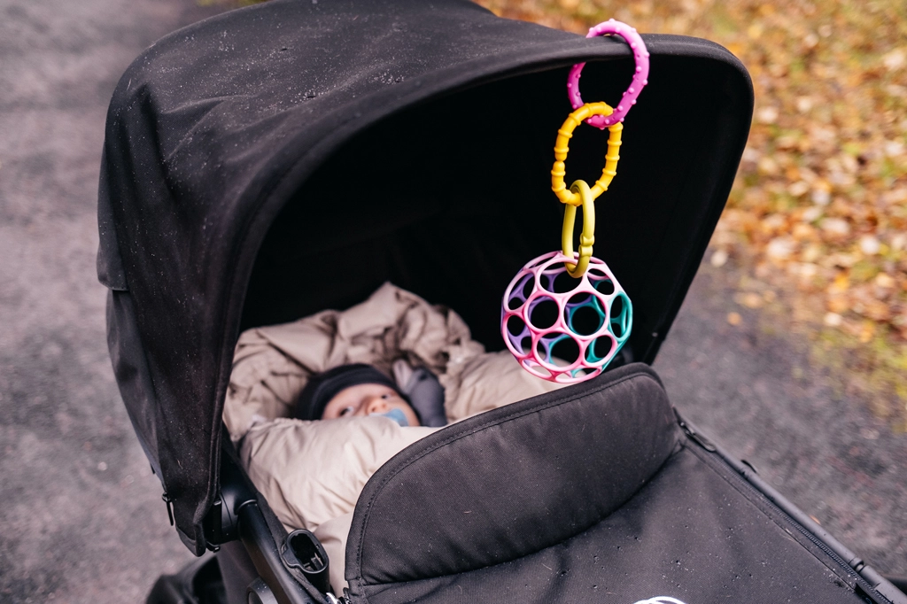 Dankzij de duurzame uitvoering en de eenvoudige bevestiging aan bevestigingsringen is de bal perfect voor in de kinderwagen of autostoeltje.
