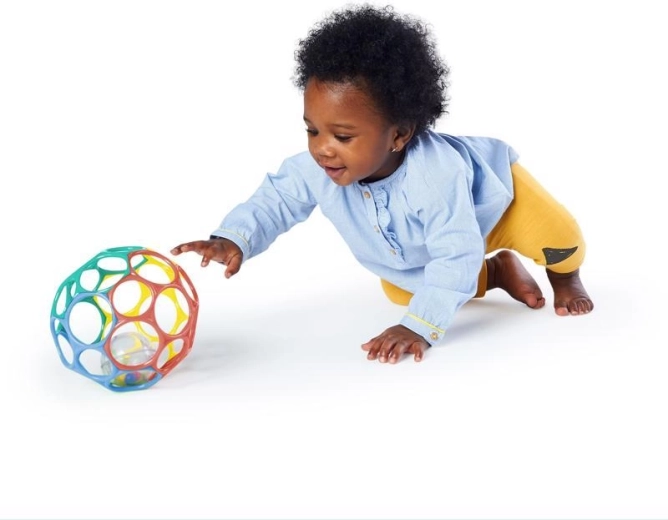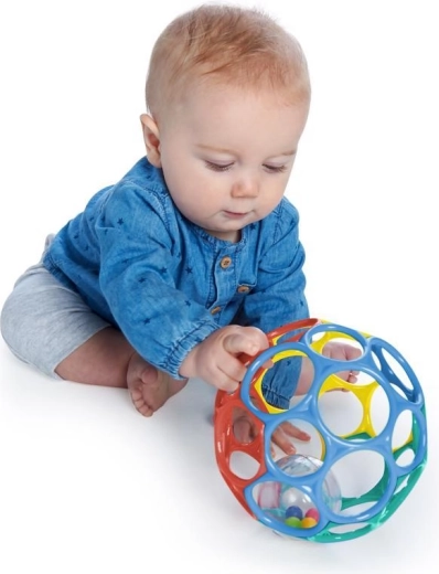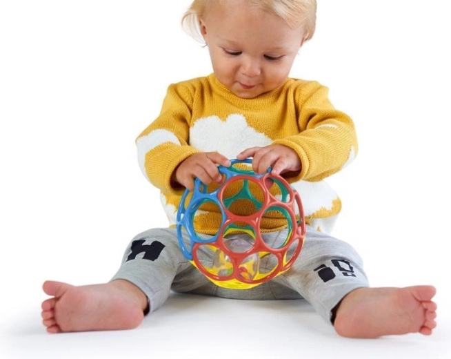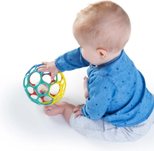De gekleurde open bal met rammelaar biedt visuele en auditieve stimulatie en ontwikkelt de motoriek.