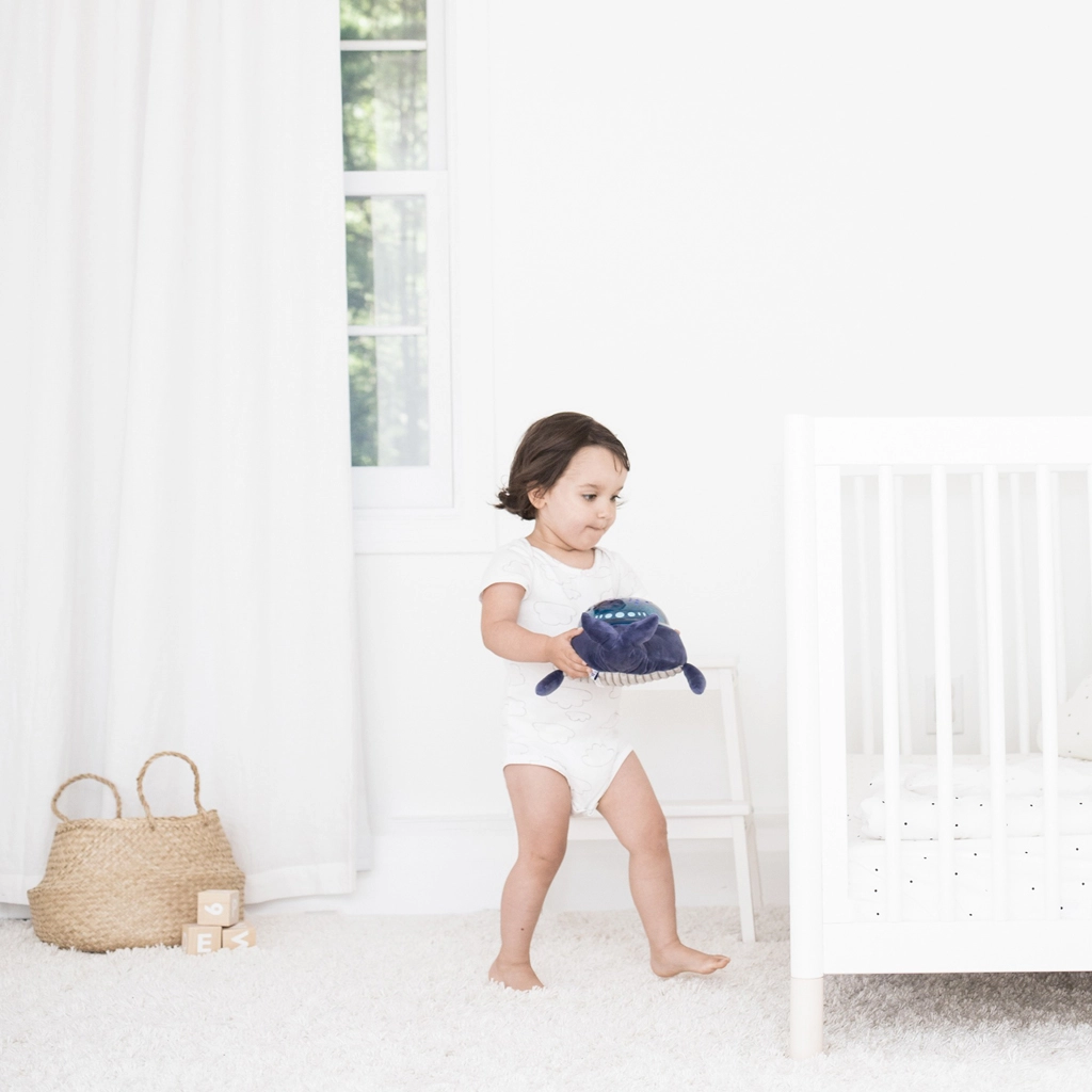 De projectorkoepel tovert rustgevende watergolven en drijvende visjes op muren en plafond, wat het kind visueel boeit en naar slaap stemt.