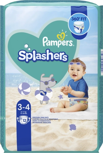 Eenmalige zwemluiers Pampers Splashers in maat 3 zijn ideaal voor het zwembad, het strand en het waterpark. In tegenstelling tot gewone luiers zuigen ze geen water op, waardoor ze hun vorm behouden en comfortabel blijven zitten, zelfs wanneer ze nat zijn. Ze hebben een 360° elastische tailleband, dubbele anti-lekrandjes en zijn aan de zijkanten voorzien van naden die je eenvoudig kunt openscheuren voor snel en schoon uitdoen.