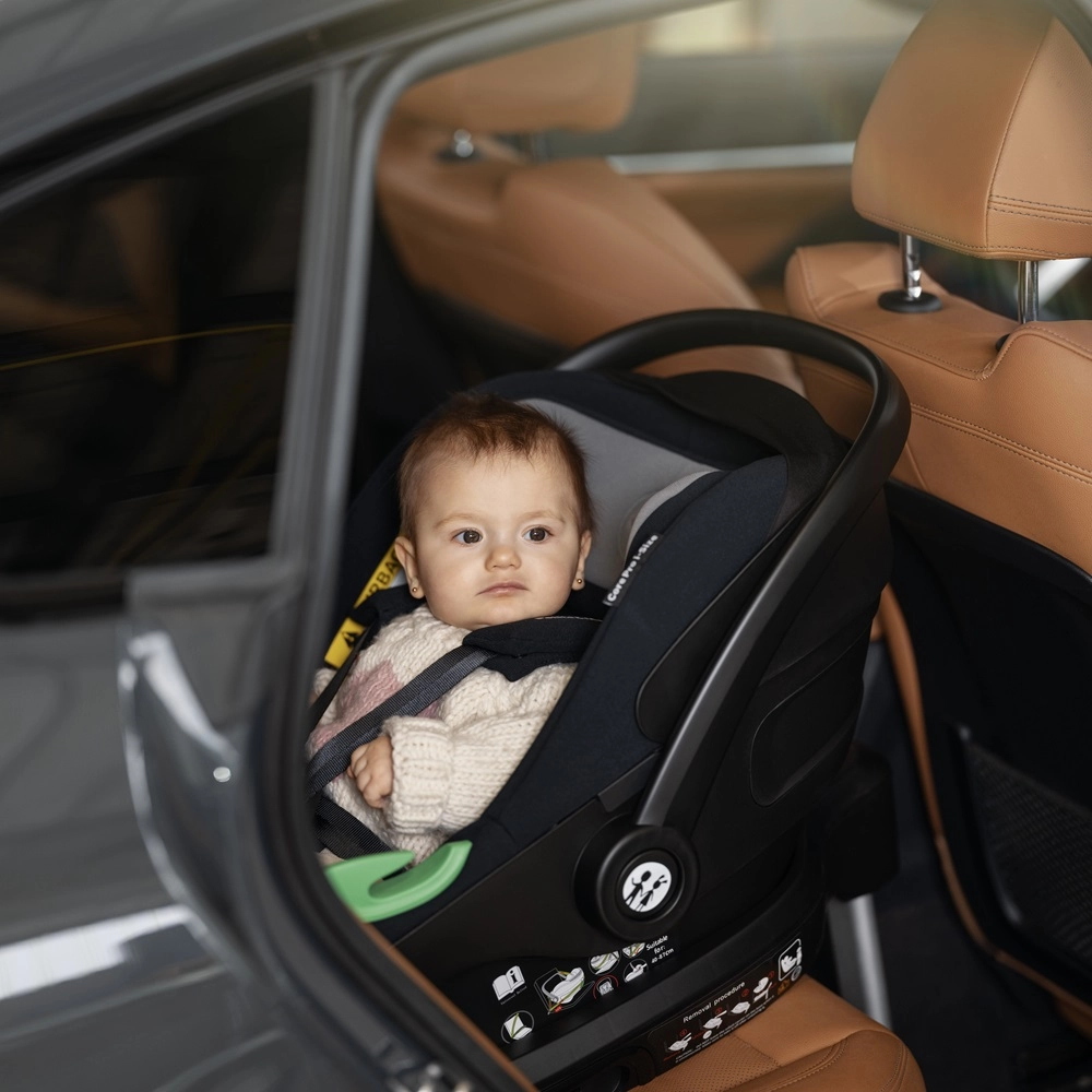 Installatie kan tegen de rijrichting in, met behulp van de veiligheidsgordels van de auto of nog eenvoudiger via de ISOFIX-basis met steunpoot. Deze set bevat de bijpassende basis, die zorgt voor snel klik–in/klik–uit bevestigen en visuele indicatie van correcte montage. Dankzij de ergonomische, verstelbare draagbeugel verplaats je het stoeltje gemakkelijk tussen auto en huis.