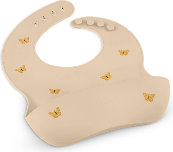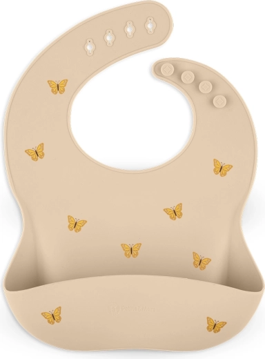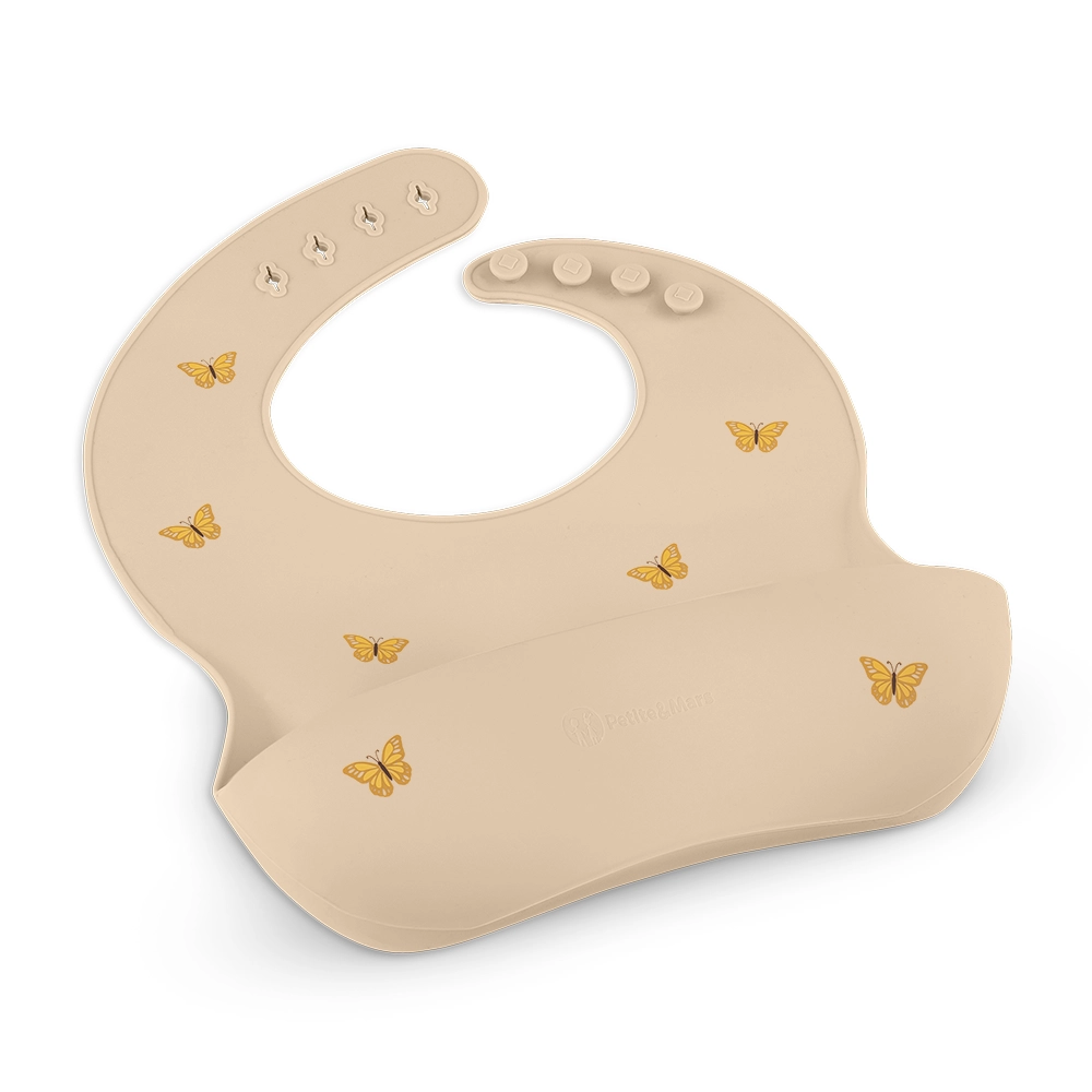 De siliconen slab Petite&Mars Take&Match in de tint Sand met subtiele vlindermotieven is de ideale hulp bij de eerste hapjes en zelfstandig eten. De ergonomische vorm en het zachte siliconen passen zich prettig aan de kinderhals aan, terwijl de diepe opvangzak vallend eten effectief opvangt en kleding schoon houdt.