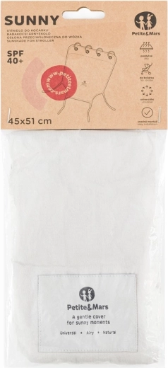 Het Sunny-zonnescherm is ontworpen voor dagelijkse wandelingen en reizen. Het beschermt het kind tegen fel licht, vermindert verblinding en helpt een aangename schaduw te behouden. Dankzij kwalitatief 100% katoen is het scherm zacht voor de babyhuid, goed ademend en makkelijk te onderhouden.