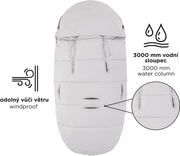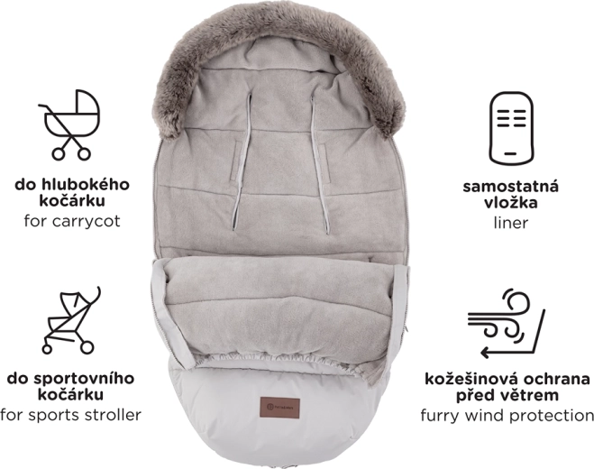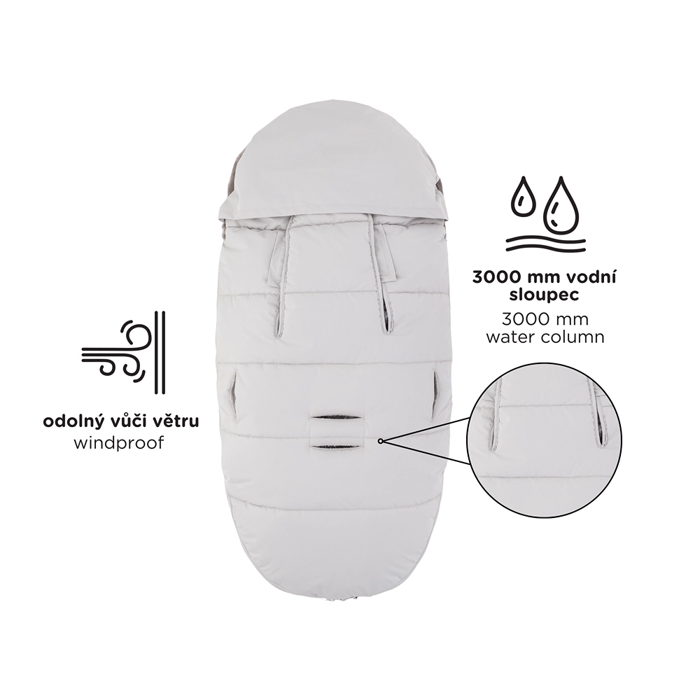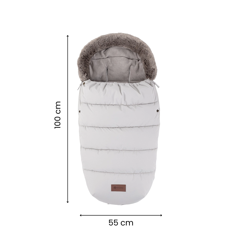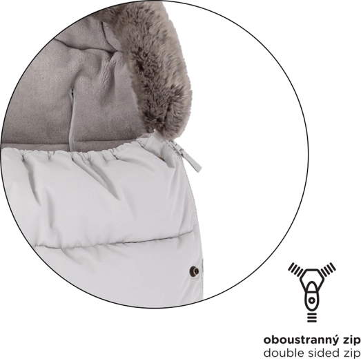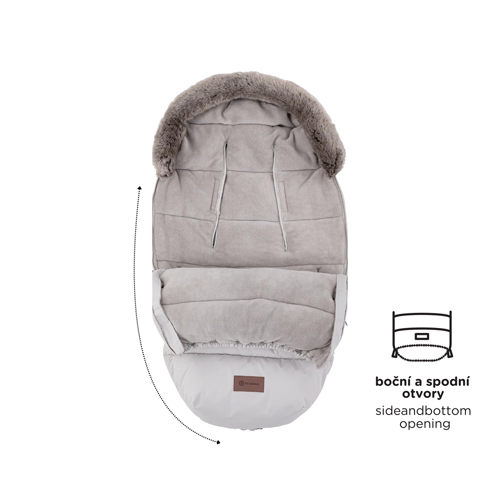 Doordachte doorlopende zijritsen maken volledig losritsen van het bovendeel, ventilatie en het creëren van een aparte inleg uit het onderste deel mogelijk. Onderaan vormen de ritsen een praktische opening voor de voetjes. Een slimme gebogen antislipzak aan de achterzijde helpt de voetenzak stevig op zijn plek te houden en de afneembare bontkraag vereenvoudigt het onderhoud.