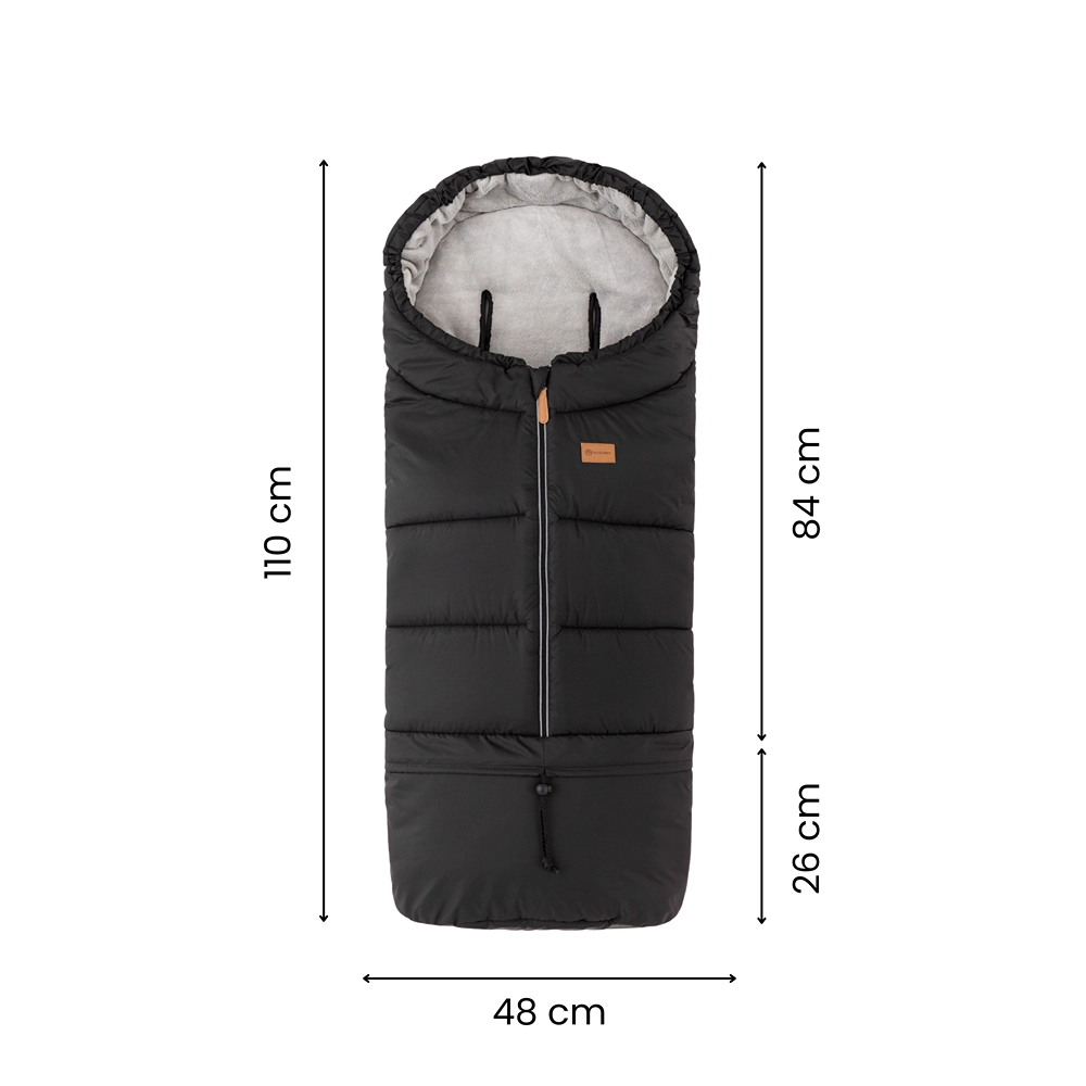 Universele winter-voetenzak 3-in-1 voor zowel diepe als sportkinderwagens en autostoeltjes. Biedt een waterafstotende en winddichte afwerking, een warme fleecevoering en gemakkelijke toegang tot het kind dankzij de centrale rits. Het afneembare onderste deel met afwasbare voering is praktisch ook voor schoentjes.